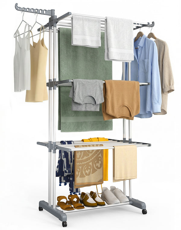 - Die stabile Konstruktion aus Metallrohren, verstärktem PP-Kunststoff und rostfreier Beschichtung sorgt für eine außergewöhnliche Robustheit. Der Standtrockner trägt bis zu 30 kg Wäsche und überzeugt durch eine deutlich höhere Langlebigkeit als herkömmliche Modelle.