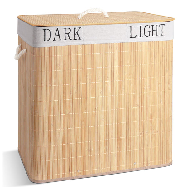 | Bambus Wäschekorb mit Deckel | Faltbarer Wäschesammler | Wäschebox Schmal | Laundry Baskets | Wäschesortierer | Wäschetonne Mit den Maßen 60x41x60 cm bietet dieser Wäschekorb aus natürlichem Bambus ein außergewöhnliches Volumen von 150L. Seine rechteckige Form sorgt für eine optimale Stabilität und passt perfekt zu den Bedürfnissen von Familien, sei es im Wäscheraum, Schlafzimmer oder Badezimmer. Der Korb ist in drei separate Fächer unterteilt, die es ermöglichen, die Wäsche nach Farbe, Textilart oder Familienmitgliedern zu sortieren. Eine ideale Lösung, um den Waschbereich organisiert zu halten und Zeit im Alltag zu sparen. Der Wäschekorb wird mit zwei abnehmbaren Innensäcken aus Polyester-Baumwollgewebe (160 g/m²) geliefert, die in der Maschine gewaschen werden können. Diese Anordnung ermöglicht einen Wechselbetrieb: Während der eine Sack gewaschen wird, bleibt der andere einsatzbereit. Die Säcke lassen sich leicht entnehmen und separat reinigen, ohne den gesamten Korb bewegen zu müssen. Der Wäschekorb lässt sich flach zusammenfalten, wenn er nicht in Gebrauch ist, was die Aufbewahrung im Schrank oder in einer versteckten Ecke erleichtert. Zwei geflochtene Griffe sind an beiden Seiten des Korbes befestigt, sodass er auch bei voller Beladung bequem transportiert werden kann. Der stabile Bambusdeckel schützt die Wäsche vor Staub und reduziert die Verbreitung von Gerüchen im Raum. Er sorgt dafür, dass der Inhalt aus dem Blickfeld bleibt und bietet gleichzeitig eine gepflegte und ordentliche Optik für ein sauberes, angenehmes Zuhause.