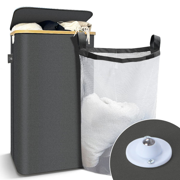 | Wäschekorb mit Deckel | Faltbarer Wäschesammler | Wäschebox Schmal | Laundry Baskets | Wäschesortierer | Wäschetonne GROSSE KAPAZITÄT Unser leichter Wäschekorb hat ein Fassungsvermögen von 100 Litern, so dass Sie eine große Menge an schmutziger Kleidung darin verstauen können, ohne ihn regelmäßig leeren zu müssen. ROBUST UND NACHHALTIG Unser faltbares Wäschebox besteht aus einem wasserdichten und atmungsaktiven Stoff, der nicht nur anti-Schimmel und wasserdicht ist, sondern auch die Belüftung des Schmutzwäschebehälters erleichtert. Außerdem ist sein Rahmen aus robustem Bambus gefertigt, stabil und langlebig. PRAKTISCHE BENUTZUNG Dieser Wäschesammler hat nicht nur zwei Bambusgriffe, sondern auch einen dritten Griff auf der Rückseite, sodass Sie die Wäsche auch bei vollem Korb leicht in die Waschmaschine entleeren können. Außerdem schützt der Deckel auf der Oberseite vor Staub und Gerüchen. BEWEGBARER INNENSACK Unser Wäschesortierer verfügt über einenwaschbaren Netz-Innensack und zwei Tragegriffe. Er kann amBambusrahmenbefestigt werden, um ihn in aufrechter Position zu halten, oder einfach herausgenommen werden. EINFACH ZU VERSTAUEN Dieser Wäschekorb mit großem Fassungsvermögen ist faltbar.Seine gefaltete Größe beträgt nur 41x33x7 (cm). Wenn Sie ihn nicht brauchen,können Sie ihn zusammenfalten und ineiner Schublade oder Ecke verstauen.