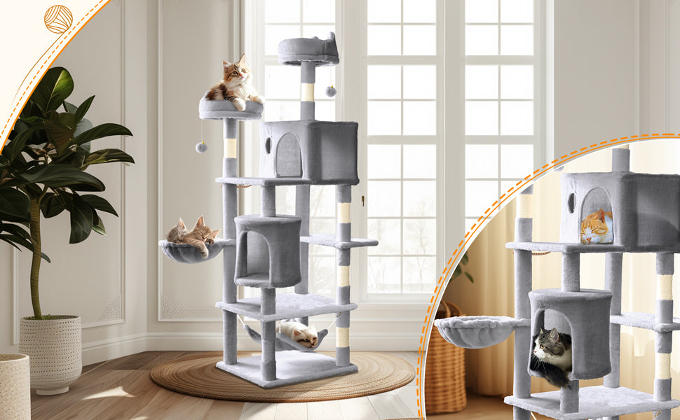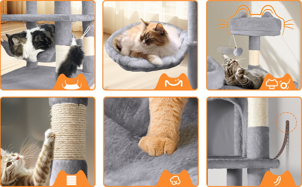 - MULTIFUNKTIONAL: Unser 168 cm hoher Kletterbaum für Katzen hat 5 Höhenebenen, die Ihrer Katze die Freiheit geben, zu schlafen, zu kratzen, sich zu strecken und ihre Umgebung zu beobachten. 3 Beobachtungs- und Sprungplattformen, 1 hängendes Plüschkorb, 2 gut gepolsterte Plattformen, 1 Hängematte, 2 hängende Bälle mit Glöckchen und 6 Kratzsäulen ermöglichen Ihrer Katze, diesen kompletten Kratzbaum in vollen Zügen zu genießen.