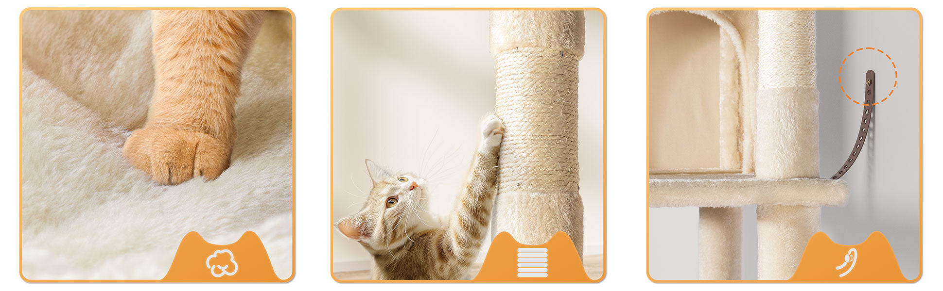 - Stabile und sichere Struktur: Der Katzenturm hat eine relativ breite Basis mit den Maßen 55x45 cm, die eine soliden Stämme und ausgezeichnete Stabilität gewährleistet. Er ist außerdem mit einer Fallschutzvorrichtung ausgestattet, mit der er an einer Wand oder einer anderen Oberfläche befestigt werden kann, um zusätzliche Sicherheit zu gewährleisten. Er kippt auch dann nicht um, wenn mehrere Katzen gleichzeitig auf ihm spielen.