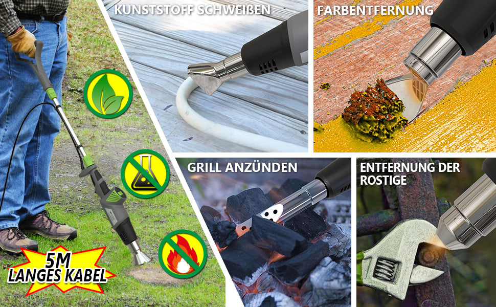 Unser Abflammgerät kann nicht nur als Unkrautvernichter, Heißluftpistole, Grillanzünder verwendet werden, sonder auch für die Erweichung der Kunststoffe und die Entfernung der Farbe in meistene Oberflächen benutzt werden, indem die verschiedenen Düsen und Modi ausgewählt werden.