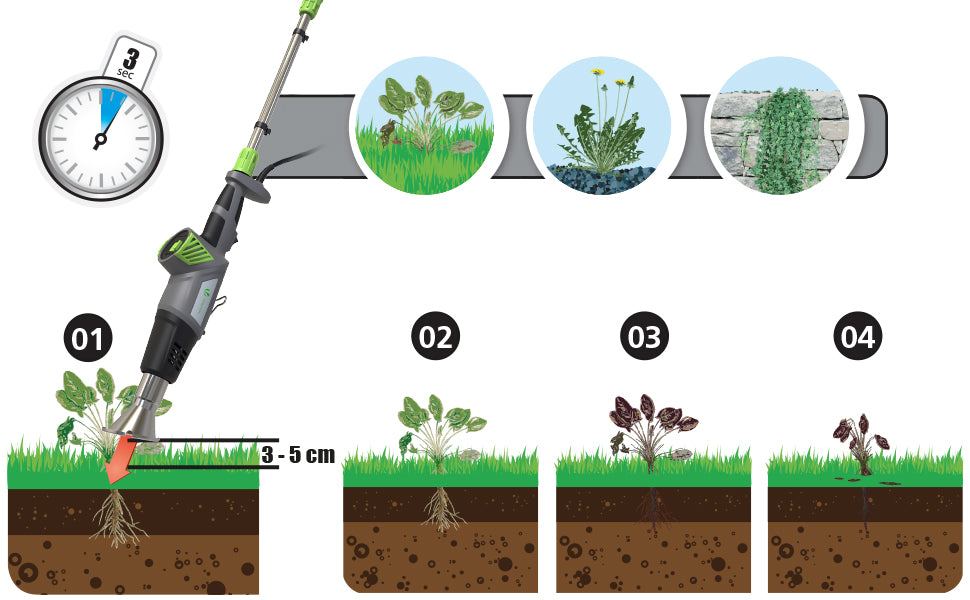- Unser thermischer Unkrautvernichter kann Unkraut in Sekunden direkt an seiner Wurzel töten, ohne dass Chemikalien und Flammen verwendet werden.